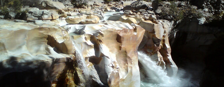 (18 km.) - the source of the Bhagirathi for a dip in its icy waters is dip in almost a must for pilgrims; and to the temple of Bhairavanath at Bhaironghati, (10 km.). GMVN Tourist Bungalow is located at Bhojbasa, about 14 km., from Gangotri, on the road to Uttarkashi, at the confluence of the Jat Ganga and Bhagirathi rivers.